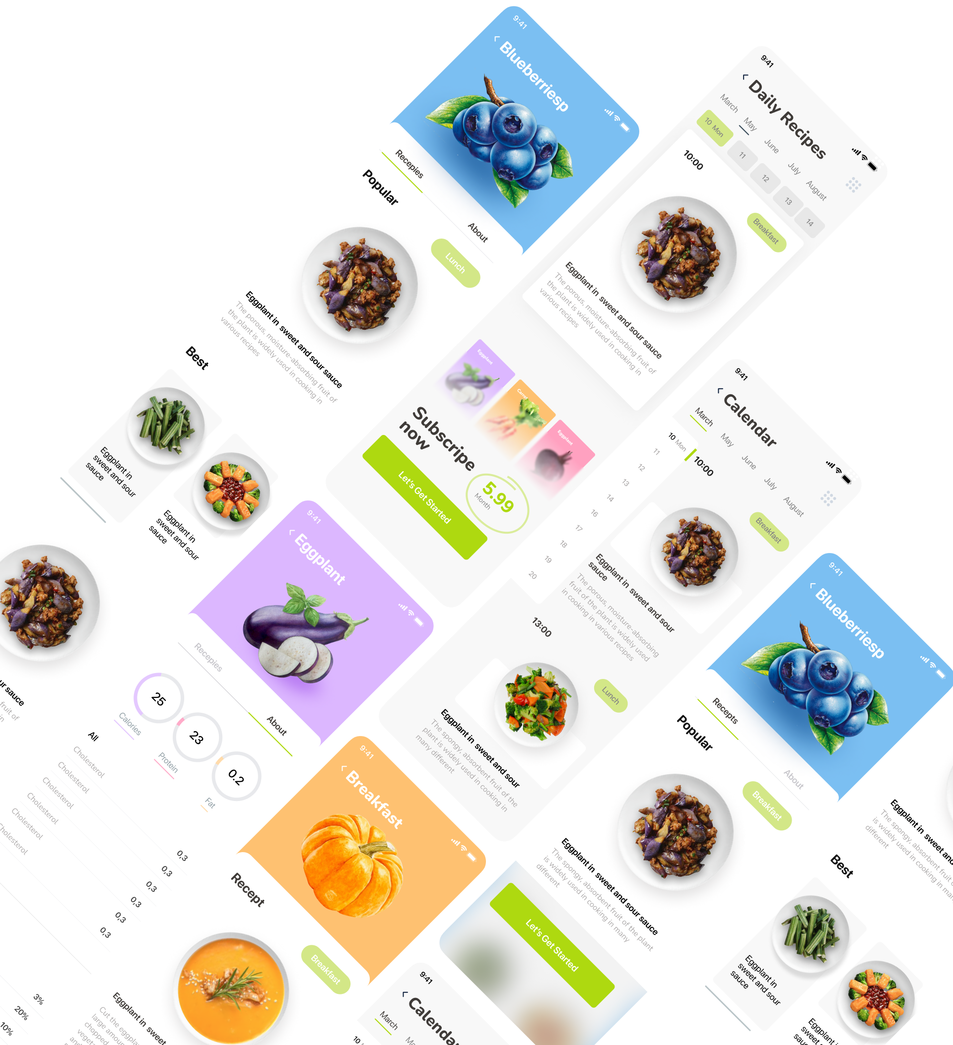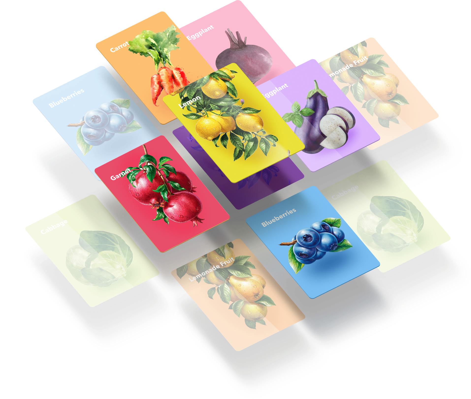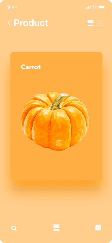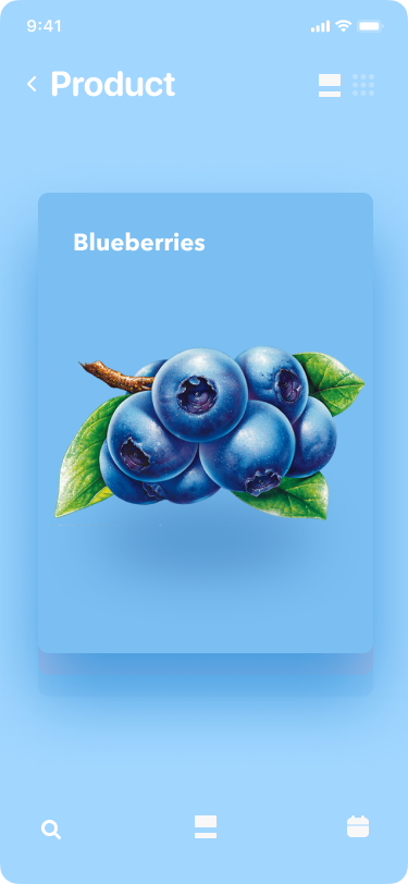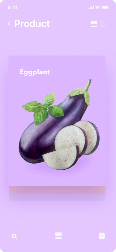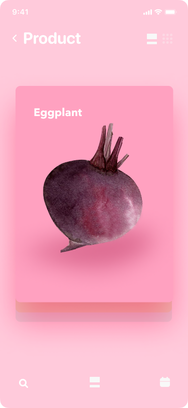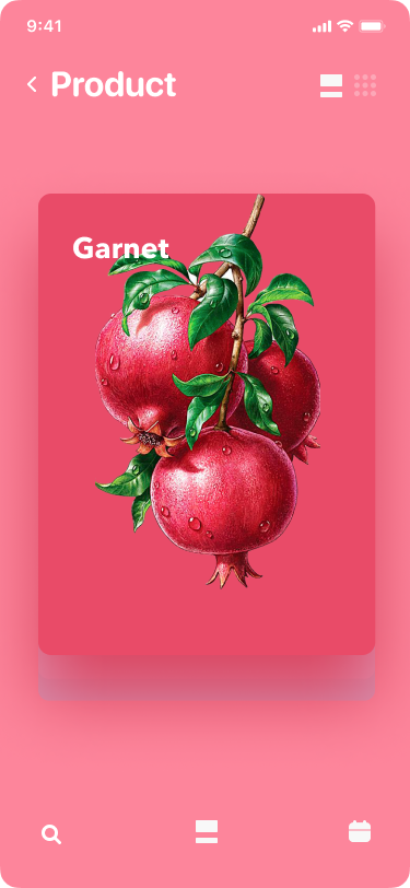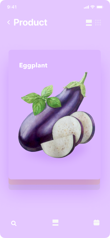 The main product navigation is carried out by swipe, you can also switch to catalog mode. Product images are made in watercolor style.